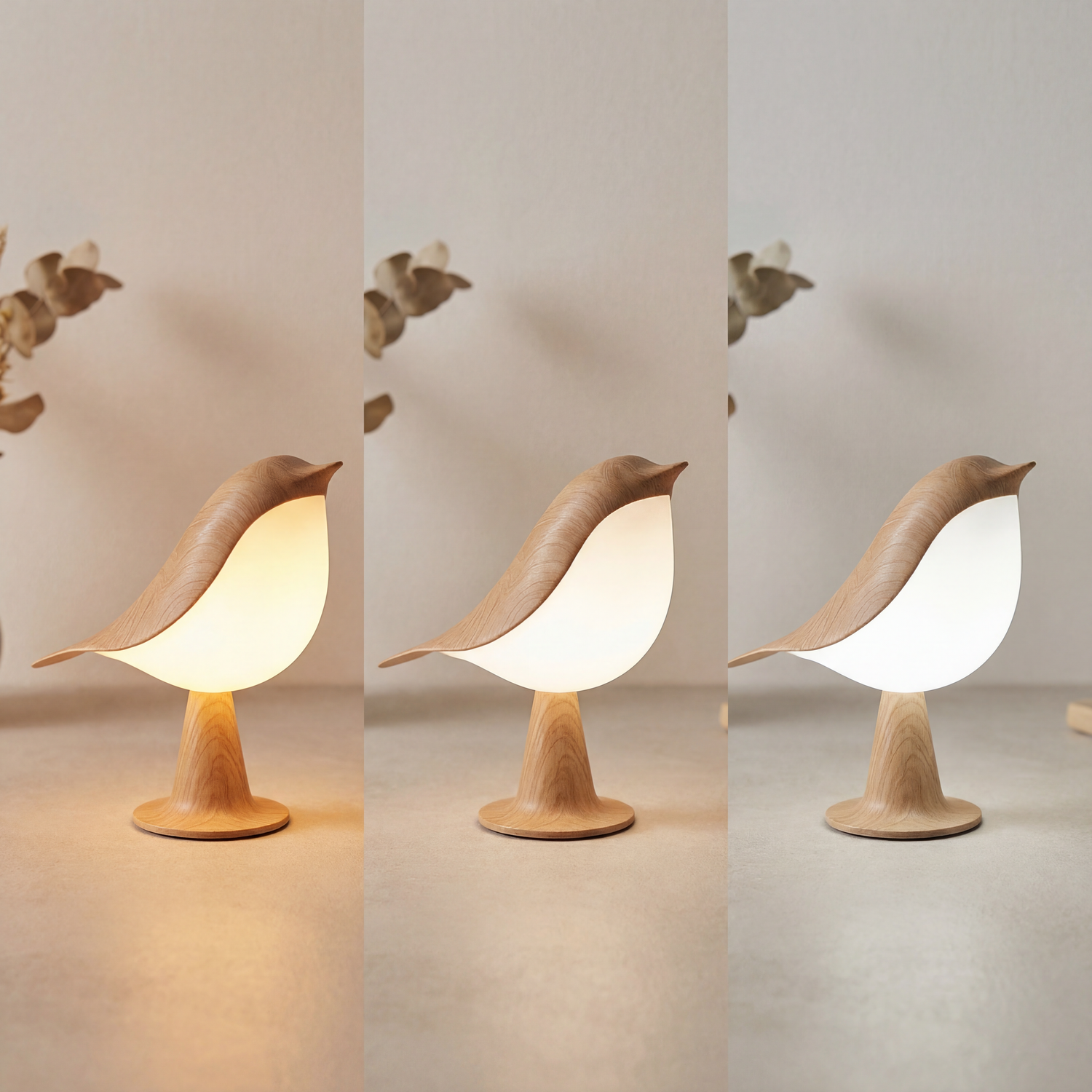 De BirdZen valt op door zijn vogelvormige design, dat elegant rust op een stijlvolle basis van licht houtimitatie.